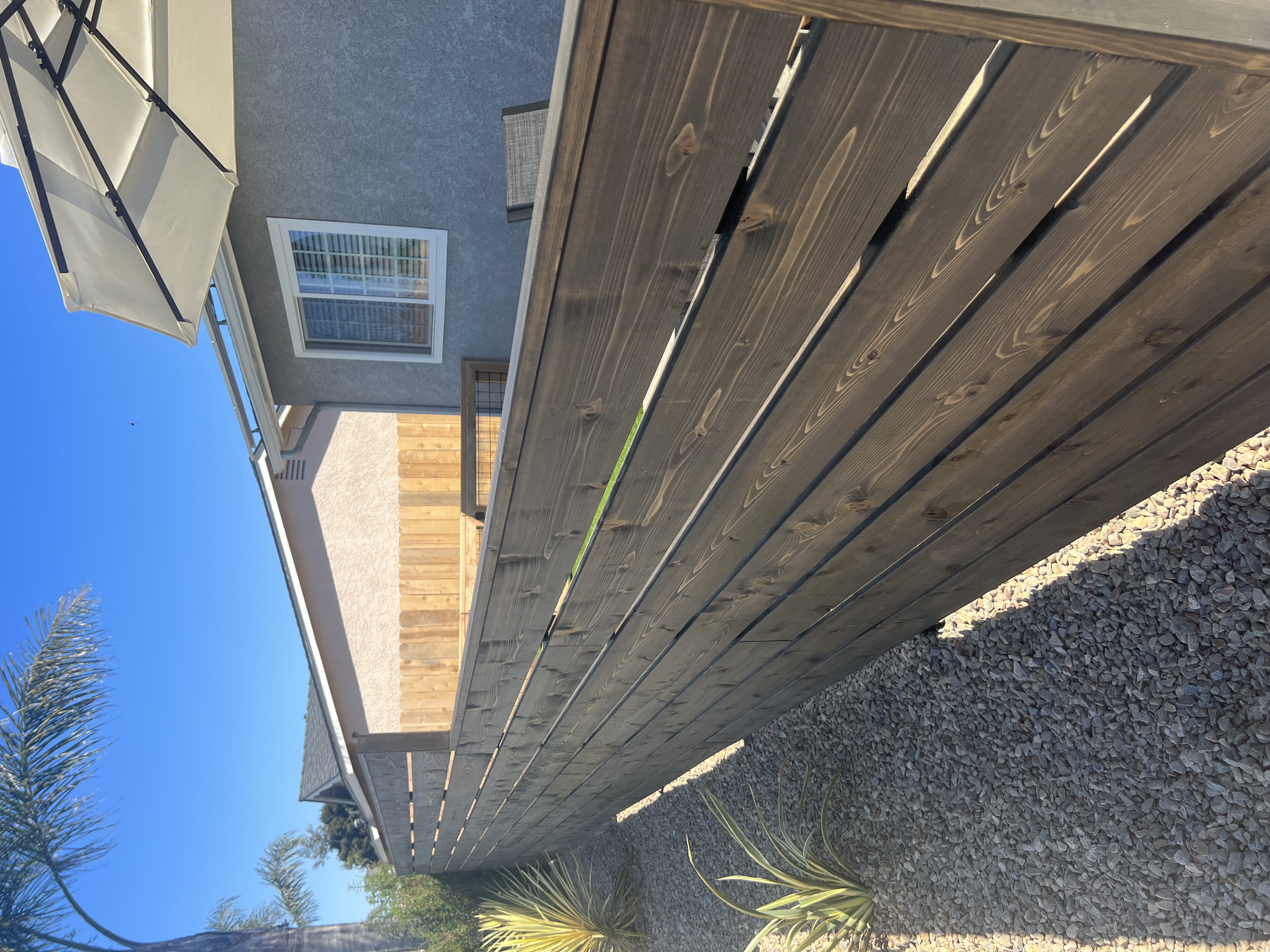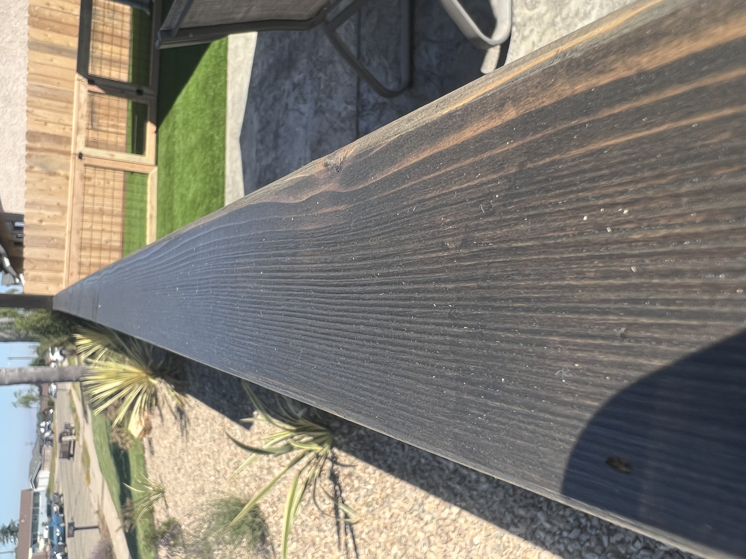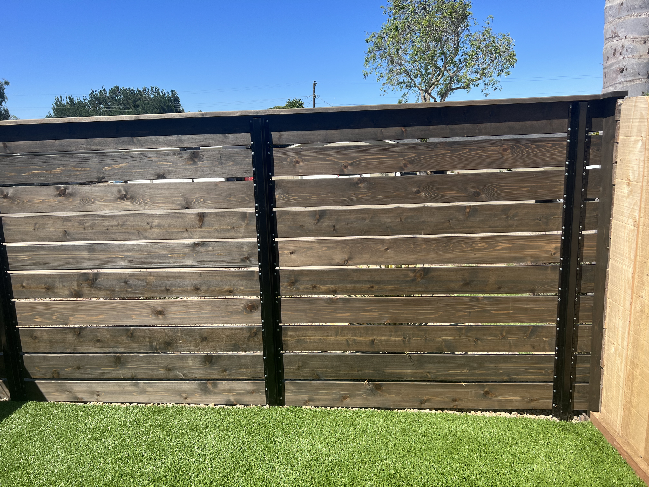 This contemporary outdoor space features a sleek horizontal fence built with dark-stained cedar boards and black powder-coated steel framing. The custom gate adds contrast with natural cedar framing and black welded wire panels for a modern, open feel. Paired with low-maintenance artificial turf, this design combines clean lines, durability, and style— perfect for a functional and inviting yard patio area