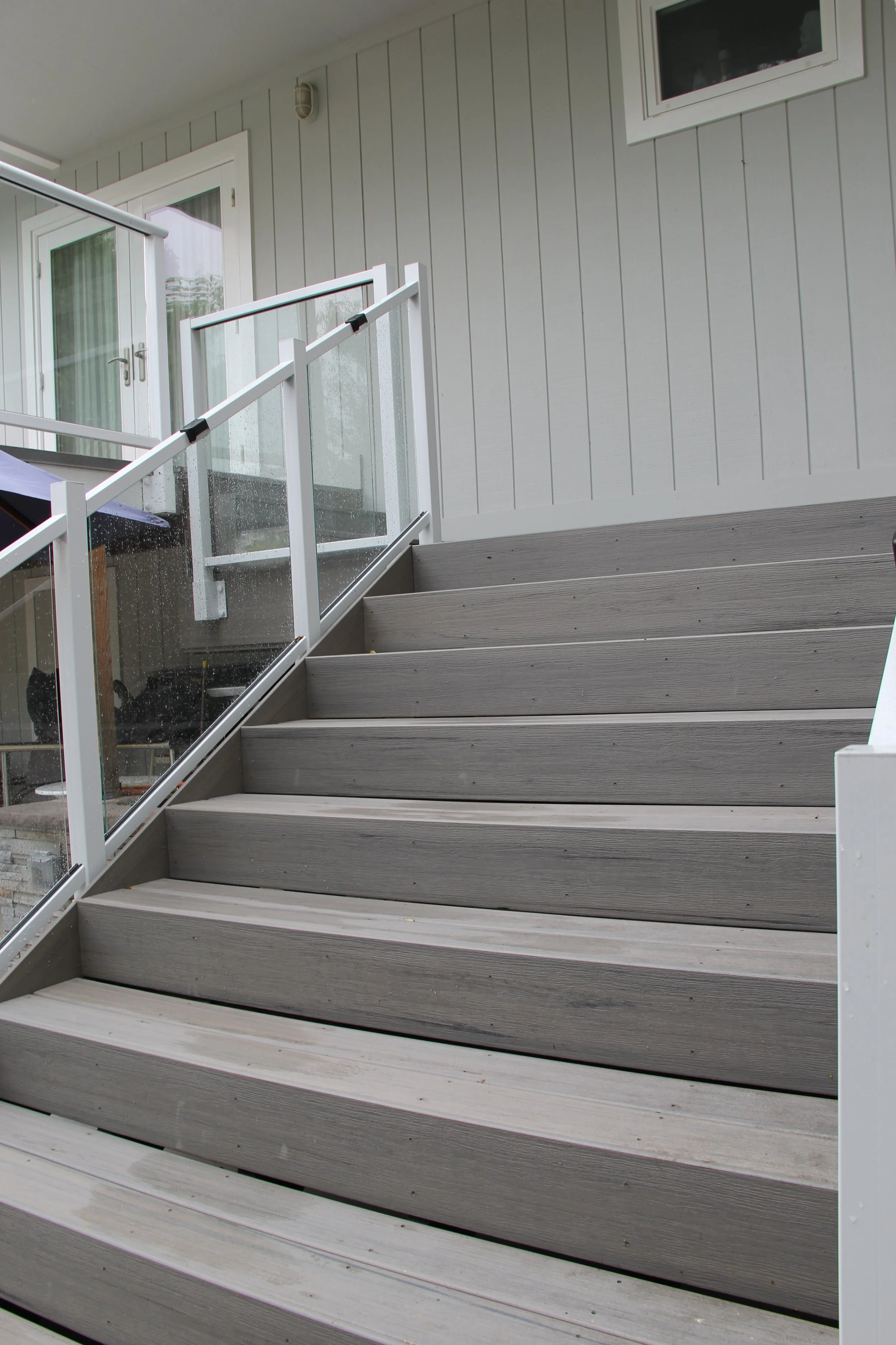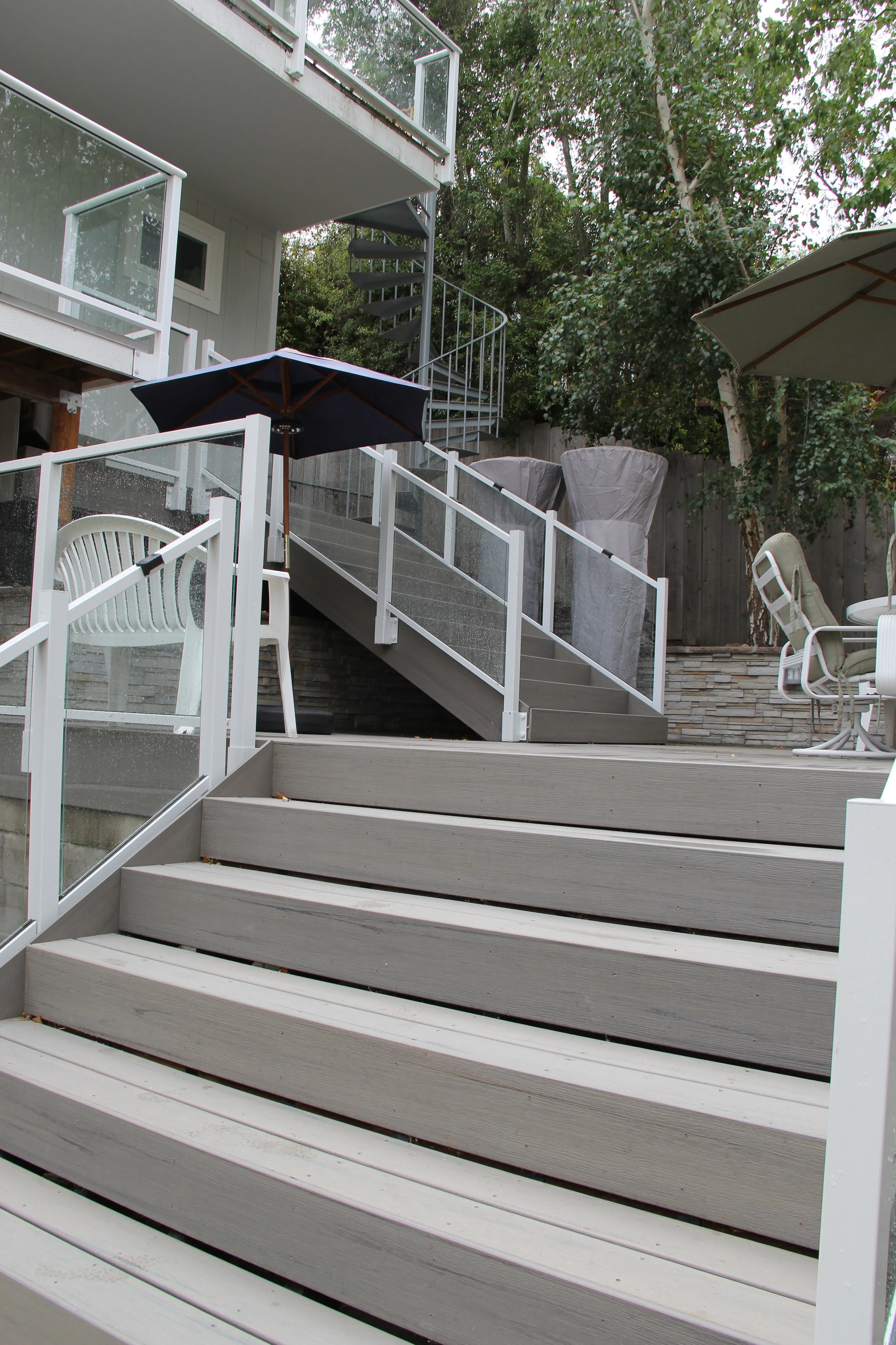 This custom two-level deck features TimberTech composite decking in the color Ashwood, offering a clean, modern look with long-lasting durability. The design includes sleek glass railings that open up the view while maintaining a contemporary feel. Our team also built the stone fireplace and custom grill station, creating a fully functional and stylish outdoor living space perfect for entertaining or relaxing year-round.
