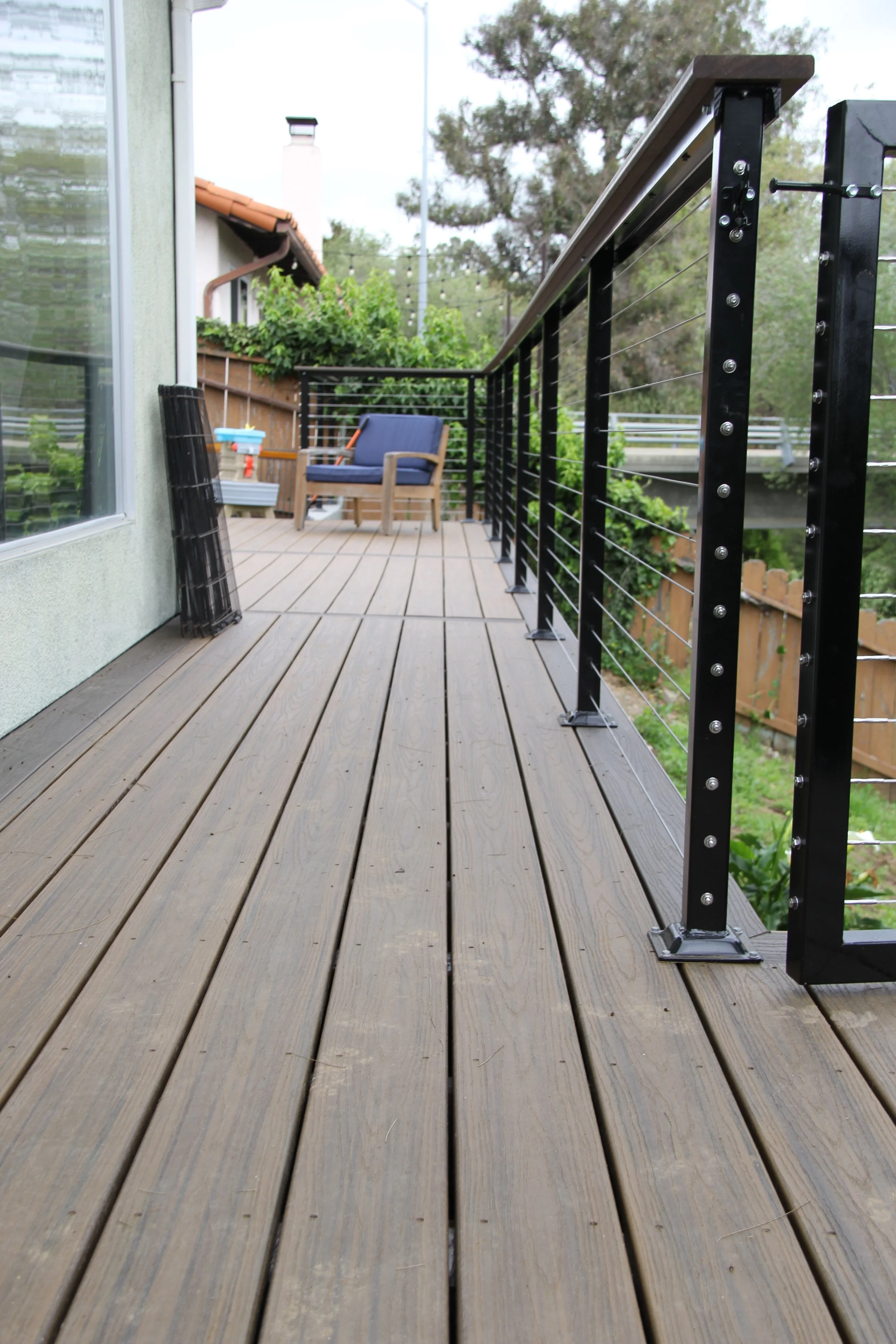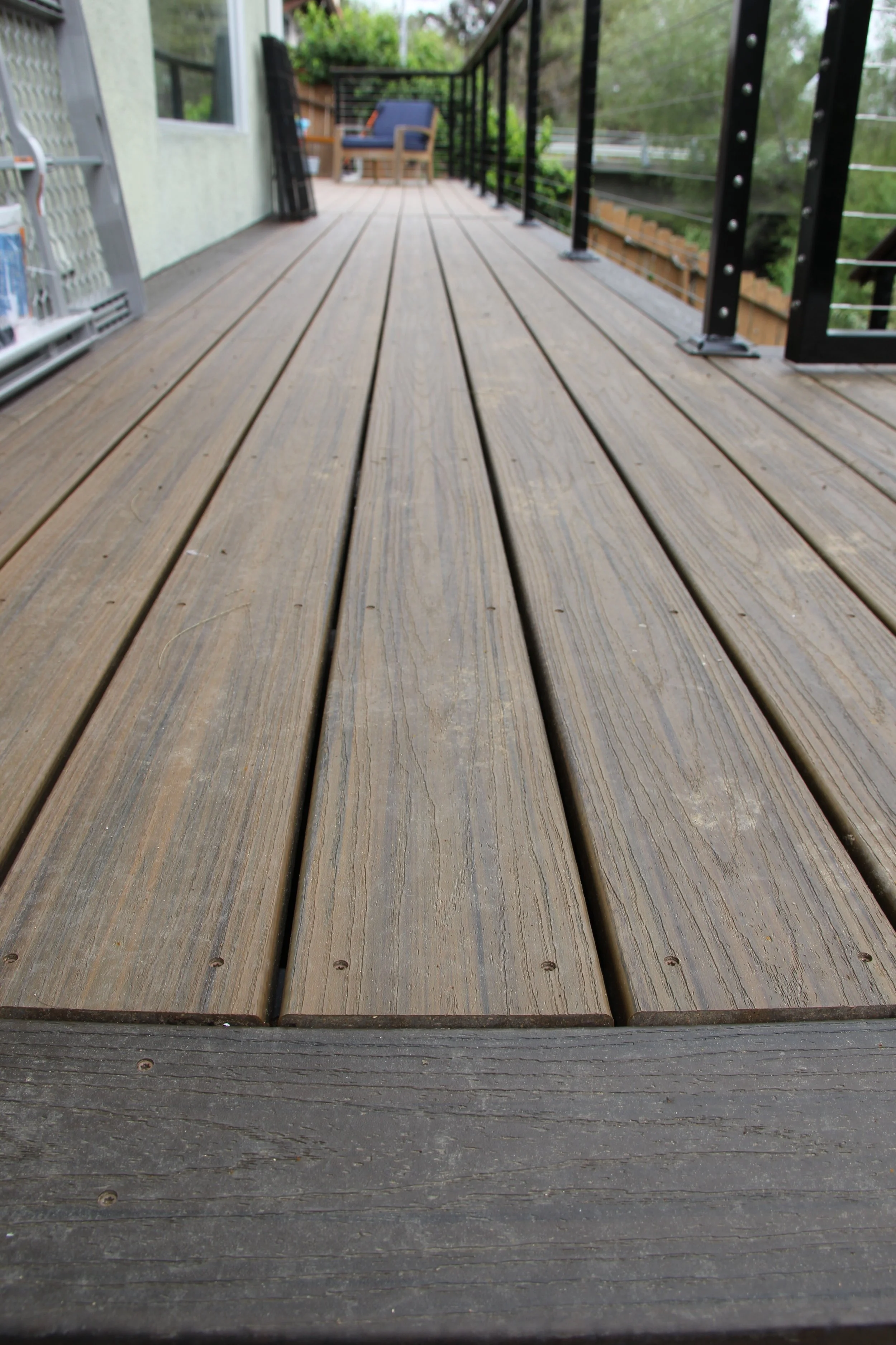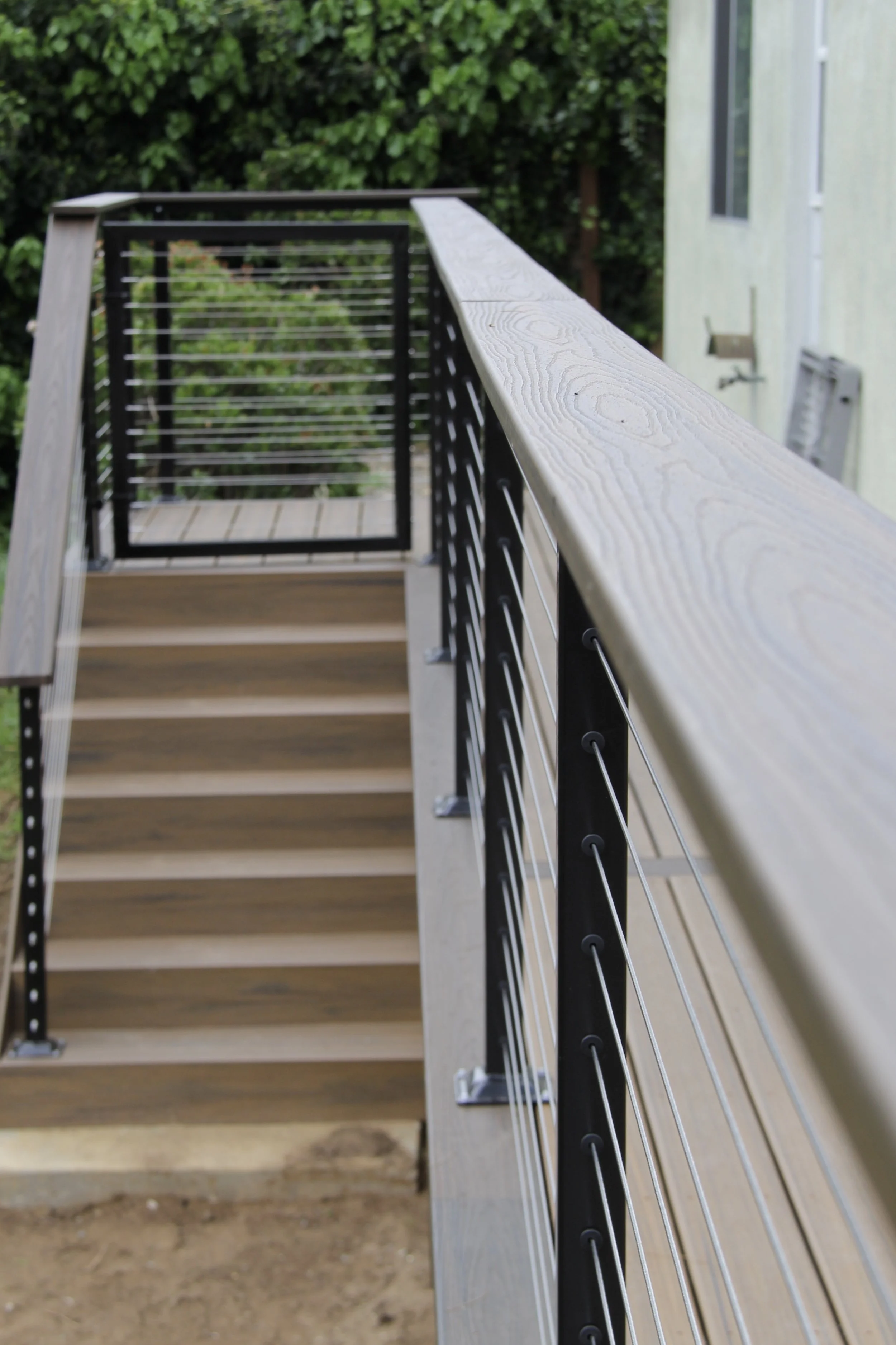 This deck features Trex decking in the color Havanna Gold and Spiced Rum. A modern elevated deck with sleek railings, a spacious overview, and stairs leading down to a private lower level — perfect for both relaxing and entertaining.