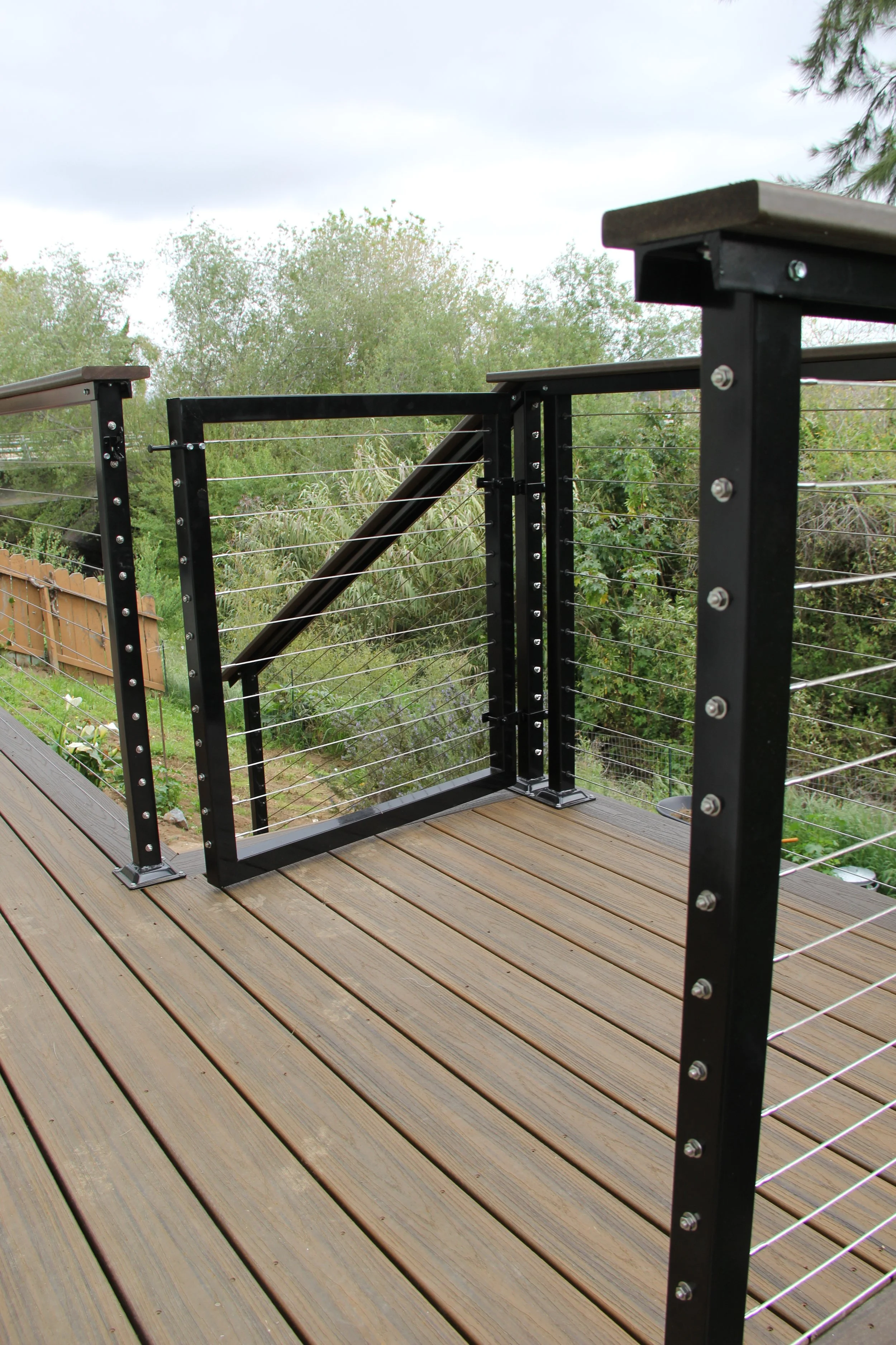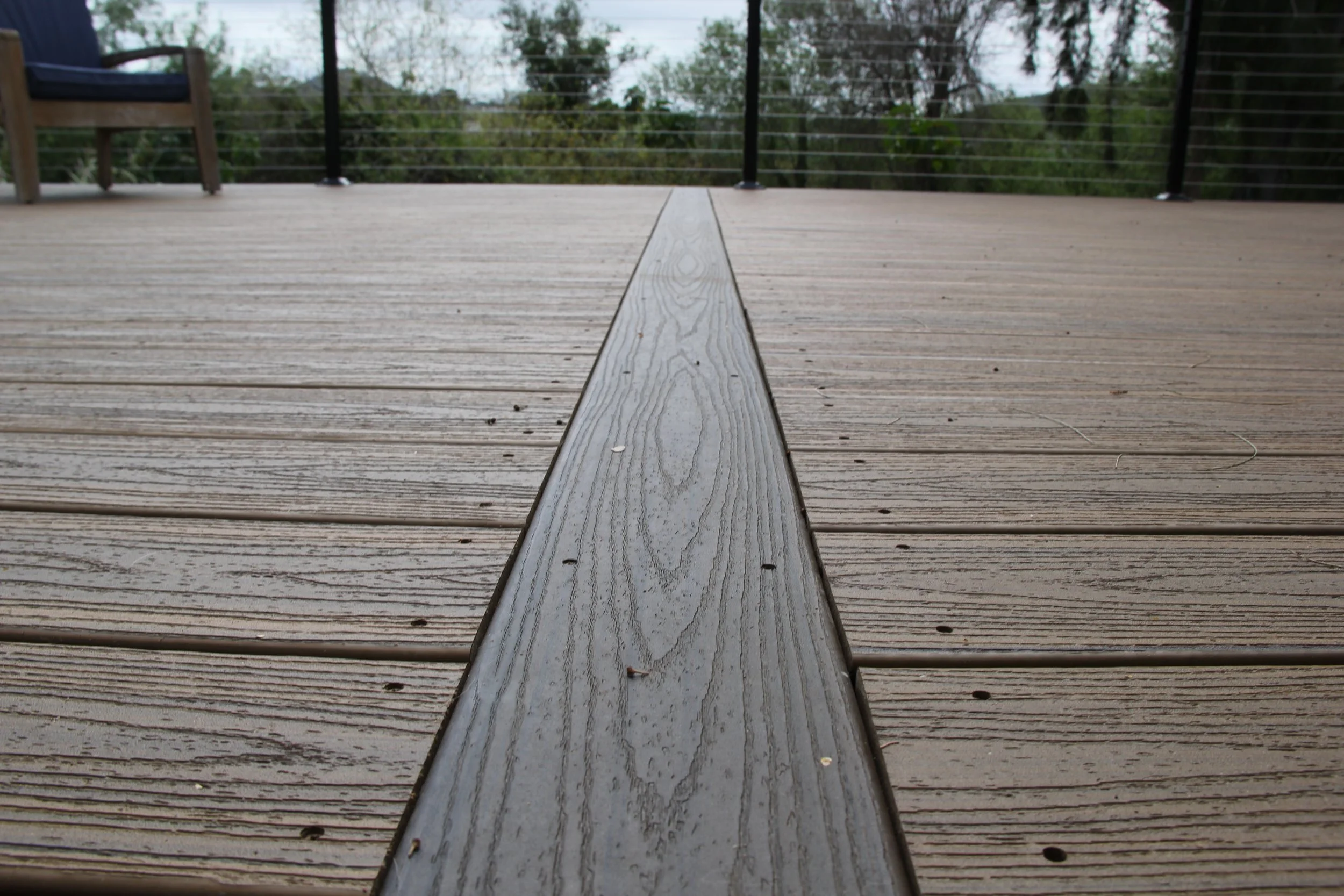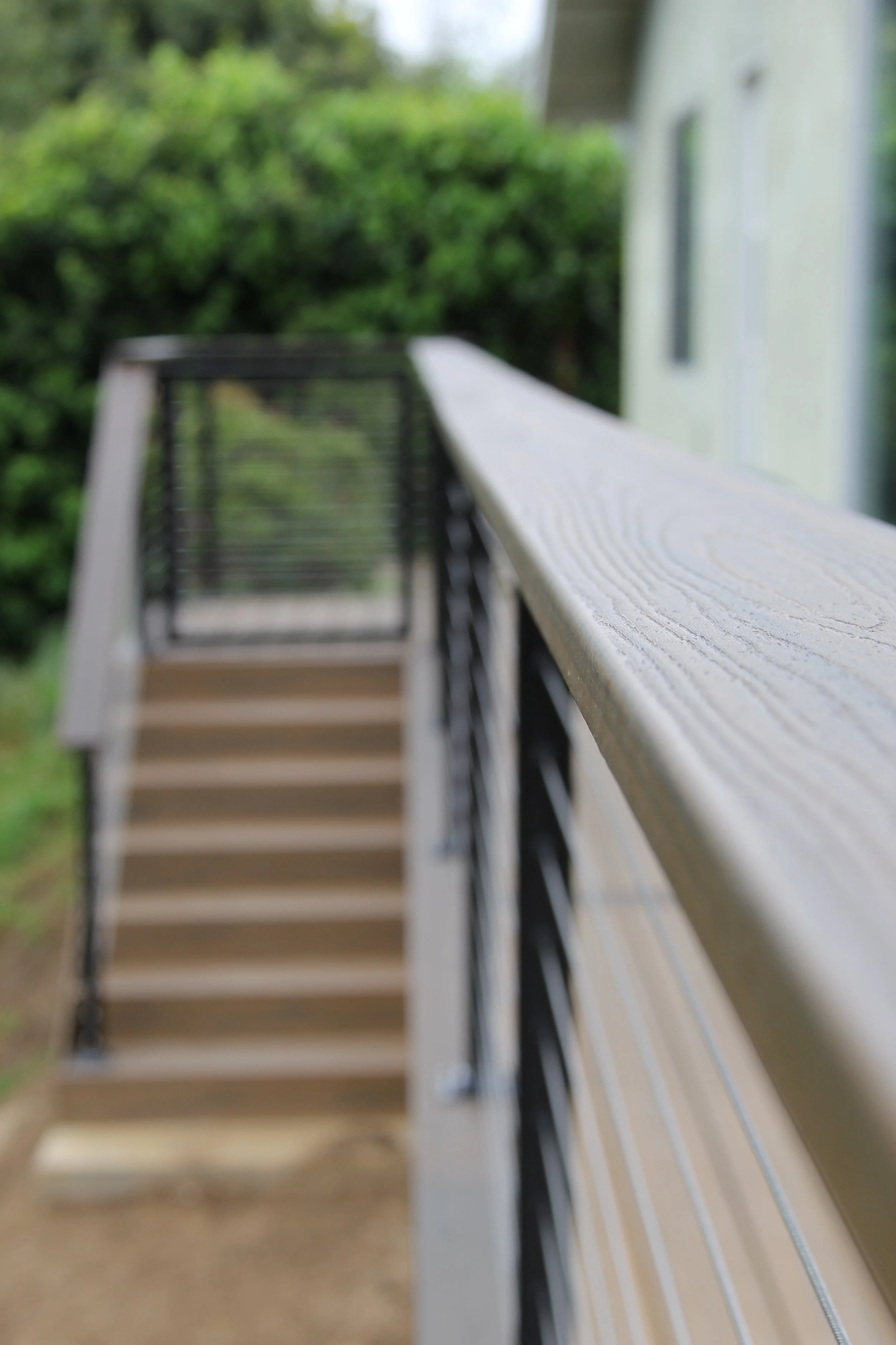 This deck features Trex decking in the color Havanna Gold and Spiced Rum. A modern elevated deck with sleek railings, a spacious overview, and stairs leading down to a private lower level — perfect for both relaxing and entertaining.